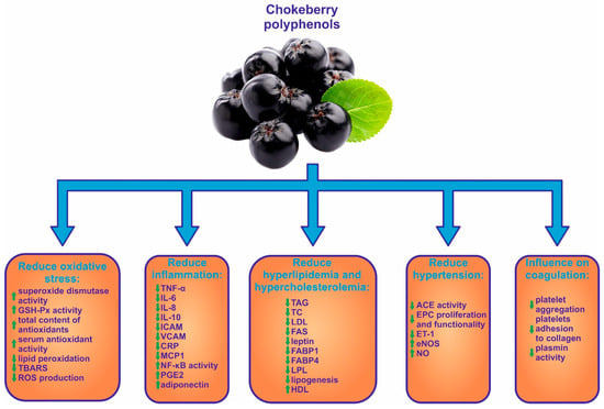 | Alcoholic extract of chokeberry fruits (10%), 30 mL a day for 40 days | Human study: patients with hypercholesterolemia, arterial hypertension and deregulated protein metabolism | TC ↓, LDL ↓, TAG ↓, glucose ↓ | [83] |