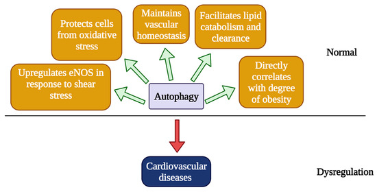 Shear stress in the vessel wall, which also plays an important role in the pathogenesis of CVD, is shown to be associated with autophagy [30]. Shear stress-induced autophagy has been found to increase cell viability, reduce oxidative stress, and increase nitric oxide synthesis by upregulating endothelial nitric oxide synthase (eNOS) [31], and accordingly, a direct correlation has been established between autophagy and eNOS production [32,33,34]. ENOS is an essential regulator of endothelial function and endothelium-mediated vasoreactivity [35]. Thus, autophagy inhibition will lead to reduced eNOS production, which will cause endothelial dysfunction and impair vascular homeostasis. In autophagy-deficient cells, shear stress cannot induce eNOS production, which results in increased ROS production and cellular inflammation by stimulating the production of cytokines; a potential cause for CVDs, such as diabetes and hypertension [35].