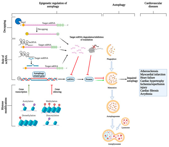 Epigenetic regulation of autophagy. Three types of epigenetic regulations are discussed in this review: mRNA decapping, regulation of gene transcription and translation by ncRNAs, and histone modifications. All three processes tightly control autophagy by regulating the expression of autophagy-related genes. The decapping enzyme Dcp1 is responsible for removing the 5′cap on the target mRNAs which leads to decreased mRNA stability and consequent degradation by exonucleases. NcRNAs, such as miRNAs, can bind to target mRNAs leading to their inhibition or degradation or inhibition depending on the degree of complementarity between miRNA and mRNA. Another ncRNA, lncRNAs can control autophagy-related gene expressions either directly by interacting with target mRNAs leading to their degradation, or indirectly by acting as “miRNA” sponges to sequester miRNAs to prevent interaction with their target mRNAs allowing gene expression. Lastly, histone modifications can also influence gene expressions. Acetylation and demethylation, in most cases, lead to gene transcription, while methylation and deacetylation mostly lead to gene silencing. Reduced expression of autophagy-related genes can lead to dysregulated autophagy, which is linked to CVDs.