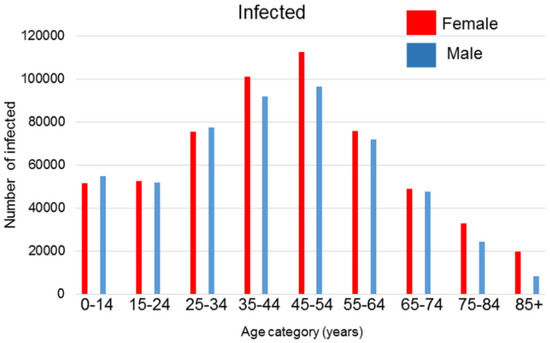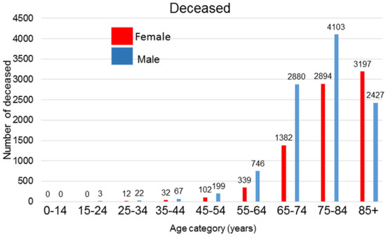 COVID-19 is a severe respiratory infection that possesses a pandemic character caused by the SARS−CoV−2 coronavirus, which is a virus similar to the SARS and MERS viruses. Published global epidemiologic data show that while the incidence of infection is only negligibly sex-dependent with some protective role of estrogens in premenopausal women, males die more frequently than females [1,2]. Data from the Ministry of Health of the Czech Republic released up to mid-February 2021 does not contradict these observations (Figure 1 and Figure 2). Experimental data obtained from ovariectomized mice showed more severe courses of SARS−CoV or MERS infections than in control animals [3], which also supports the hypothesis that estrogens possess a certain protective effect against viral infection in females because of their anti-inflammatory and immunomodulatory effect [4]. However, data concerning the role of estrogens are equivocal because there are no significant differences in mortality observed between premenopausal and postmenopausal Chinese women [5]. This can be due to the high dietary intake of isoflavonoids in Eastern Asia.