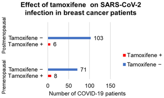 On the other hand, tamoxifen is an ERM (estrogen-receptor modulator) that is frequently used to treat breast cancer patients. While short-term tamoxifen application could be helpful in anti-COVID-19 therapy, its long-term application may reduce expression of estrogen receptors (ERs). Hence, this therapy can increase the susceptibility to SARS−CoV−2 [24,25]. In order to address this hypothesis, we retrospectively analysed a group of 273 breast cancer patients suffering from triple-negative and HER2-positive cancer from the Department of Oncology (First Faculty of Medicine, Charles University and General Teaching Hospital, Prague). We focused our analysis on the incidence of clinically manifested infection that was later confirmed in symptomatic patients as COVID-19 by PCR. We reviewed the period during the COVID-19 epidemic, specifically between March 2020 and February 2021, when vaccination became broadly available to our patients. These patients received chemotherapy or endocrine treatment combined with trastuzumab. Patients on immunotherapy, CKD4/6 inhibitors, everolimus or alpelisib were excluded. Similarly, we excluded patients with cancer duplicity or multiplicity and the patients who were already COVID-19 vaccinated. Our data suggest the influence of tamoxifene on SARSe−CoV−2 clinically manifest infection in our breast cancer patients (Figure 3).