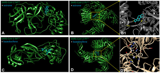 The best docking pose of estrone (above) and bazedoxifene (below) to the SARS−CoV−2 main protease structure (Mpro) (A,C) and papain-like protease (PLpro) trimer (B,B1,D,D1). Pymol representation of the SARS−CoV−2 main protease (PDB id 6y7b) shown as a green ribbon with the secondary structure elements indicated. In blue sticks: the best docking pose for estrone (A) or bazedoxifene (C). The best docking poses of the estrone (B,B1) and bazedoxifene (D,D1) molecule in PLpro trimer (PDB id 6w9c) are localized in the vicinity of the zinc ion present at the central interface of the trimer.