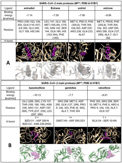 The best docking pose of estrogens (A) and other examples of ERM, such as bazedoxifene, genistein and raloxifene (B) to the SARS−CoV−2 main protease structure (Mpro) with characterization of the interaction including hydrogen bonds.