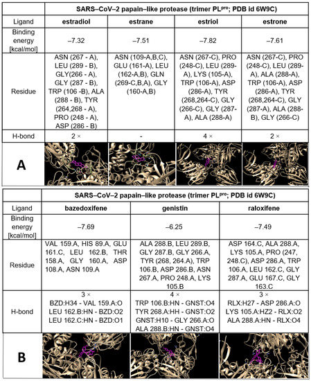 The best docking pose of oestrogens (A) and other examples of ERM such as bazedoxifene, genistin and raloxifene (B) to the SARS−CoV−2 papain-like protease structure (PLpro) (trimer form) with characterization of the interaction including hydrogen bonds.