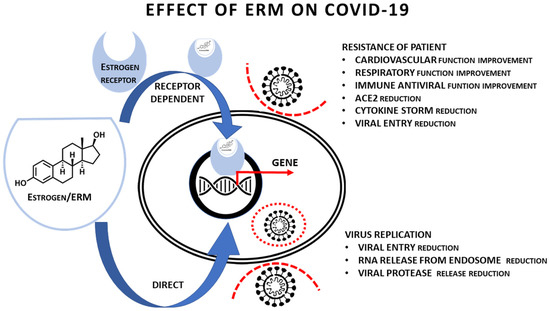 Summarization of the potential role of ERMs including estrogen in COVID-19.