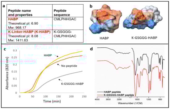 (a) Specifications of the peptides. (b) Three-dimensional molecular structure of HABP and K-GSGGG-HABP. (c) Optical density change during the mineralization media in the presence of HABP, K-GSGGG-HABP, and with no peptide. (d) The molecular structure of the peptides was confirmed using FTIR.