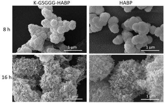SEM was used to compare the morphology of the particles formed in the presence of HABP and K-GSGGG-HABP peptides after 8 and 16 h incubations. The 8 and 16 h mineralization reaction samples have similar morphological characteristics (Figure 3). Spherical particles of similar shape and size were observed in both groups.