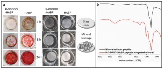 (a) Mineral layer obtained on the surface of the 24-well plate at different time points were stained with Alizarin red (Left), the minerals produced on the slides. The increasing mineral coverage on the glass slides over different time points (right). (b) FTIR results of the minerals obtained after overnight mineralization reaction with and without peptide.