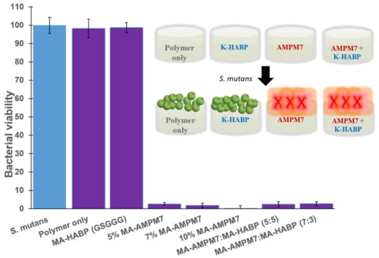 We studied the antimicrobial activity of AMP-tethered-polymer discs, HABP-tethered-polymer discs, and polymer-only controls against S. mutans. Neither the HABP-tethered-polymer discs nor the polymer-only controls inhibited S. mutans bacterial growth. In contrast, the formulations with 5 to 10 wt% AMPM7-tethered-polymer discs exhibited substantial antimicrobial activity (Figure 6). In our previous study, coupling of antimicrobial peptides in the polymer formulation without conjugation showed dependence on the presence of polar functional groups for antibacterial efficacy [25]. Here, AMPM7 has been successfully conjugated prior to polymerization and the peptide-tethered-polymer discs showed strong inhibition against S. mutans.