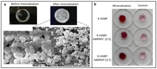 (a) K-GSGGG-HABP:AMPM7 integrated polymer disc samples were monitored under SEM after overnight mineralization reaction. (b) Peptide integrated polymer discs after mineralization were stained with Alizarin Red. The same type of discs without mineralization were used as controls.