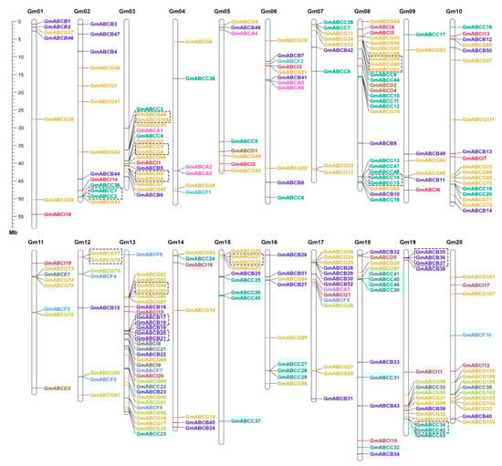 The 255 identified GmABC genes were unevenly located on the 20 chromosomes, and the distribution across the chromosomes varied widely (Figure 1). The chromosome Gm13 harbored the largest number of GmABCs (32 genes/~12.6%), followed by Gm08 (27 genes/~10.6%); Gm04 exhibited the smallest number with six genes (~2.6%) (Table S4). Chromosome Gm06, 02, 17, 18, 20, 19, 03, and 10 contained 11, 13, 14, 14, 15, 16, 17, and 18 GmABC genes, respectively. A total of seven genes each were distributed on chromosomes Gm01, Gm09, and Gm14; eight genes each were scattered on chromosomes Gm05, Gm11, and Gm12; nine genes each were present on chromosomes Gm07, Gm15, and Gm16. As reported in other studies, the most GmABC genes (~90%) were located in both ends of the chromosomes, in addition to Gm13.