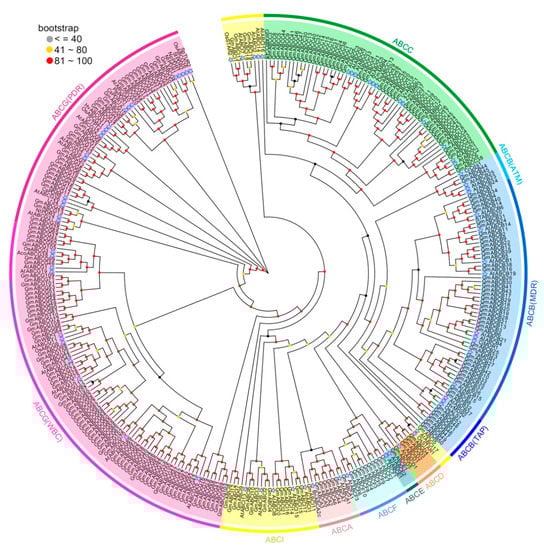 All the protein sequences of 255 soybean ABC proteins and 77 previously reported ABC transporters from other plant species were used for multiple sequence alignments by MAFFT 7.0 (https://mafft.cbrc.jp/alignment/server/, last accessed 11 July 2020). The unrooted phylogenetic tree was then constructed by MEGA 7.0 using the ML algorithm with 1000 bootstraps. The result of the ML tree was viewed and edited by Evolview [78].