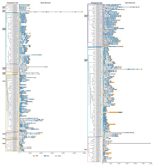 Gene structures of subfamilies GmABCA—GmABCG in soybean. Orange boxes, blue boxes, and black lines indicate UTRs, exons, and introns, respectively. The exon and intron length are calculated by the scale at the bottom.
