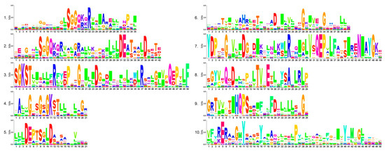 To gain the conserved domain of GmABCs, we analyzed them by using the MEME program. A total of 10 conserved motifs were predicted and comprised approximately 21–50 conserved amino acids (Figure 4, Table S3). As shown in Figure S1, GmABCs in the same branches displayed a similar motif order and composition as the gene structure. Both of them further supported the classification of subfamilies. Motifs -2, -4, -6, and -10 were prevalent in most GmABCs except in some GmABCGs, GmABCB, GmABCD, GmABCE, and GmABCF, respectively; motifs -1, -4, and -5 were arranged in the same order within most GmABCCs and GmABCGs, followed by motifs 6 and -9 separately. Common motifs occur in most GmABCs, and some members in separate subfamilies also contain their unique motifs; for instance, motif -7 only existed in the GmABCBs; motifs -8 and -9 basically only existed in GmABCA, GmABCG, GmABCD, and GmABCG, respectively, whereas motif -3 was mainly found in GmABCA—GmABCD. Interestingly, some putative GmABCs (e.g., GmABCI20) did not contain the above domain but contained the typical domain of ABC transporters while containing dozens of amino acids.