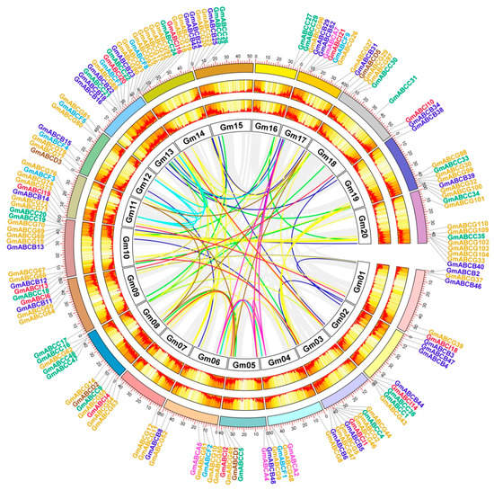 Schematic of the interchromosomal relationships of soybean ABC genes. Gray lines indicate all syntenic blocks in the soybean genome, and the colored lines indicate duplicated ABC gene pairs. The heatmaps represent the gene density.