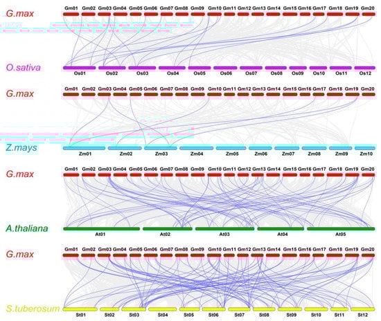Collinearity analysis of ABC transporter genes between soybean and four other species (A. thaliana, O. sativa, S. tuberosum, and Z. mays). The gray curved lines represent the collinear blocks in the whole genome of soybean and other plants, the four species. The purple curved lines represent syntenic ABC transporter gene pairs.
