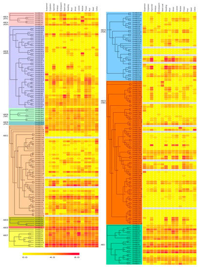 Expression patterns of ABC transporter genes in developmental stages and tissues of soybean. The color scale bars on the bellow display the expression levels (median log2 (TPM+1)) of each gene. Red represents high expression levels, whereas yellow represents low expression levels.