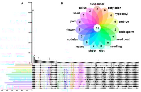 Distribution of tissue-independent and tissue-specific genes in soybean. (A) The UpSet plot depicts how many GmABCs are expressed in each tissue (suspensor, cotyledon, hypocotyls, embryo, endosperm, seed coat, seedling, root, shoot, leaves, nodule, flower, pod, seed, and callus). Each color represents a tissue, and its length refers to the number of expressed genes. The black dots indicate the number of genes expressed in each tissue. The only dot (red) represents the number of genes unique to this tissue, and two or more dots connected by a line represent the number of genes expressed in several tissues. The green, blue, golden yellow, and pink lines connecting the dots represent the number of genes expressed in two, three, four, and five tissues, respectively. The dark line represents the number of genes expressed in at least six tissues. (B) The Venn diagram shows the specific expressed GmABCs in different tissues of soybean.