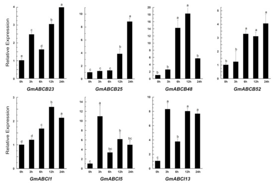 According to the phylogenetic tree, we chose GmABCB23, GmABCB25, GmABCB48, GmABCB52, GmABCI1, GmABCI5, and GmABCI13 for further gene expression analysis by qRT-PCR (Figure 9). These genes were chosen because they were on the same evolutionary branch as genes with known functions related to aluminum toxicity. Therefore, we analyzed and then performed qRT-PCR to identify their expression patterns related to aluminum toxicity. After treatment, the expression of all selected genes was induced by Al in roots, but the induced expression was different. GmABCB25 and GmABCB52 were upregulated; GmABCB25, GmABCB48, and GmABCI1 were first upregulated and then downregulated; GmABCB23 and GmABCI13 were first upregulated and then downregulated, and finally recovered to a high level (Figure 9).