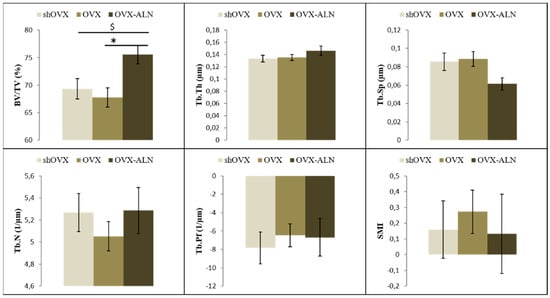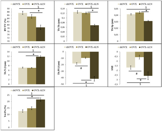 Bar diagrams illustrating the micro-architectural parametric values of the trabecular bone of the second maxillary molar at the inter-radicular septum. *, $: Values with the same sign are statistically significantly different, with p < 0.05. BV/TV, bone volume/tissue volume; Tb.Th, trabecular thickness; Tb.Sp, trabecular spacing; Tb.N, trabecular number; Tb.Pf, trabecular pattern factor; SMI, structure model index; shOVX, sham-ovariectomy surgery; OVX, ovariectomy surgery; OVX-ALN, OVX group treated with the anti-resorptive bisphosphonate drug alendronate sodium trihydrate.