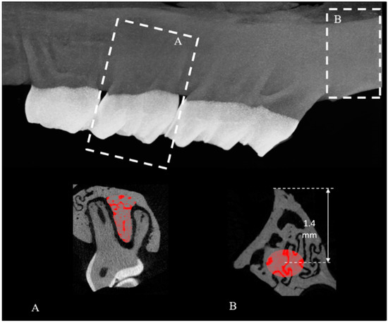 In order to quantify the trabecular bone in the inter-radicular septum of the M2, a dataset set was created which exclusively contained the M2 region. Using the Data Viewer software (Bruker, Kontich, Belgium), the sample was subsequently re-oriented and the trans-axial dataset was used for analysis as this plane provides optimal visualization of the M2 anatomy. The dataset contained on average 280 to 350 slices. The analysis started by determining a reference point, which was set as the middle slice of the dataset. The drawing of the ROI in the 2D plane was performed on 50 slices (resulting in a 3D volume of interest, VOI) downwards from this reference point. For each slice within the defined VOI, the ROI was delineated manually matching with the area occupied by the trabecular bone (region with porosities and void) by free-hand drawing. The ROIs were interpolated for the entire VOI (Figure 3A).