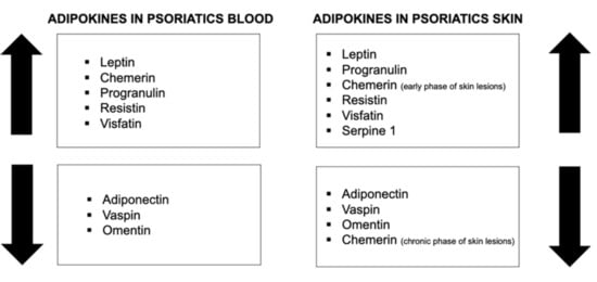 The expression of adipokines, which are secreted mainly by adipose tissue, is also abnormal in psoriatic skin. Leptin, which is involved in cell proliferation and inflammation in psoriatic skin, has been found to be overexpressed in psoriatic skin lesions in individuals with severe disease compared to those with a milder course or healthy persons [16]. Chemerin and progranulin are responsible for regulating inflammatory cell profiles in psoriatic skin [16]. Whereas progranulin expression in psoriatic skin has been proved to be elevated [16], in the case of chemerin, it is more complex [42]. In the early and active phase of skin involvement in psoriasis, the expression seems to be elevated, while in the chronic phase of this dermatosis, it decreases [42]. Resistin and visfatin contribute to the maintenance of the local inflammatory condition in psoriatic lesions. Their concentration has been proved to be elevated [16]. Adiponectin, vaspin, and omentin are regarded as anti-inflammatory adipokines, so their expression in psoriatic skin is decreased [16,43]. SERPINE1, which takes part in extracellular matrix degradation, is suspected to be overexpressed in the psoriatic tissue samples [16]. Zinc-α2-glycoprotein (ZAG) is engaged in epidermal cell differentiation and in psoriatic skin, particularly in the desquamation process [16]. It is not detected in the psoriatic plaque [44].