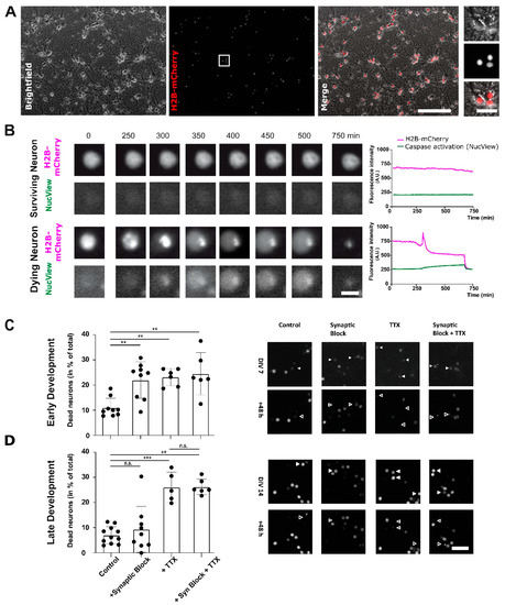 Live cell imaging of H2B-mCherry labeled primary cortical neurons can be used to quantify neuronal survival throughout development and upon pharmacological modulation of neuronal activity. (A) Representative primary cortical culture with nuclear fluorescence labeling using a transgenic mCherry-tagged histone cluster protein (H2B-mCherry) at DIV16. (B) Nuclear H2B-mCherry signal (magenta) enables the identification of hallmarks of apoptosis: chromatin condensation and DNA fragmentation. Longitudinal imaging of H2B-mCherry positive nuclei in cortical cultures shows constant signal intensity and appearance in surviving neurons without a relevant change in NucView signal (green). In contrast, dying neurons can be clearly identified by a change in H2B-mCherry signal appearance (nuclear fragmentation, swelling and condensation) followed by a strong decline in signal intensity or its disappearance. (C) Survival rates in primary cortical neurons in the early developmental period (DIV7-9) are significantly diminished upon pharmacological blockade of synaptic transmission (10 µM CNQX, 50 µM d-APV, 10 µM Gbz; n = 9/9; p < 0.01), of action potential generation (1 µM TTX; n = 6; p < 0.01) or after blockade of both processes (n = 6; p < 0.01). In the representative images, full arrowheads point to healthy H2B-mCherry positive nuclei at the start of the experiment and the unfilled arrowheads mark its former location after cells died. (D) In the late developmental period (DIV14-16), neuronal survival rates are no longer diminished by the blockade of synaptic transmission (n = 11/11; p < 0.05), but still, more neurons die during the blockade of neuronal firing (n = 9; p < 0.001). Scale bars represent 100 µm (A,C,D), 20 µm (insert (A)), and 10 µm (B). Data points indicate the mean ± SEM. **, *** indicate p-values of 0.01, and 0.001, respectively.