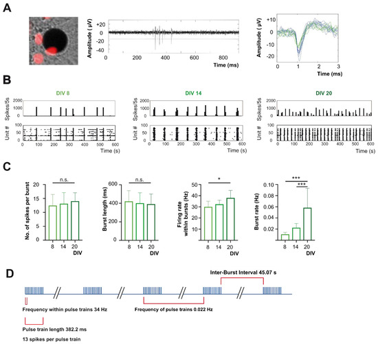 Design of stimulation protocol based on characteristics of spontaneous network activity during late development. (A) H2B-mCherry positive neurons on one of the 120 MEA-electrodes with the corresponding raw trace of electrical activity recorded. In this example, the electrode picks up action potentials with two distinct shapes above the detection threshold. Spike sorting algorithms grouped action potentials into two clusters and thus assigned them to two different putative neurons. (B) Example time histograms and raster plots of spontaneous activity at DIV8, DIV14, and DIV20. Time histograms spike rates were calculated in 5 s time bins. Note that during late development, neuronal firing patterns of cortical cultures are dominated by coherent bursting activity. (C) Quantification of properties of neuronal activity patterns. The number of spikes per burst and the burst length appeared to be stable between DIV8 and DIV20 (n = 20/5/5; p > 0.05). The firing rate in bursts increases significantly (p = 0.012) between DIV8 and DIV20. The firing rate of bursts increases significantly between DIV8 and DIV20 (p < 0.0001) and between DIV14 and DIV20 (p < 0.001). (D) Design of burst stimulation protocol mimicking spontaneous physiological activity. We based the burst stimulation protocol on the averages of the bursting parameters analyzed at DIV14. Data points indicate mean ± SEM and *, *** indicate p-values <0.05, and <0.001, respectively.