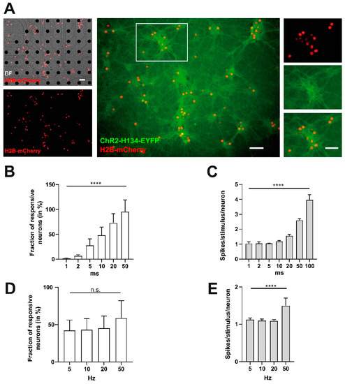 Next, we addressed the response efficiency parameters of primary neurons overexpressing ChR2 and H2B-mCherry on MEAs to LED-based light stimulation (Figure 4, n = 7 cultures). Extracellular MEA recordings showed that the fraction of neurons responding to the stimulation with 10 and 20 ms long light pulses was around 50% of the total number of units recorded before the synaptic blockade. Shorter stimuli (1–5 ms) resulted in less than 100% of expected responses and increasingly longer pulses trigger an overt number of action potentials (Figure 4B, fraction of responsive neurons 1 ms 1.69 ± 0.33%, 2 ms 6.64 ± 0.92%, 5 ms 28.09 ± 4.88%, 10 ms 48.41 ± 6.04%, 20 ms 72.98 ± 7.01%, 50 ms 95.49 ± 9.02%, 100 ms 102 ± 10.35%; p < 0.0001 One-Way ANOVA). Within the group of responding neurons, mostly one action potential was evoked per light stimulus if the stimulus duration was 20 ms or less (Figure 4C). The average number of spikes per neuron per stimulus amounted for 1 ms to 1.05 ± 0.05, for 2 ms to 1.06 ± 0.04, for 5 ms to 1.05 ± 0.01, for 10 ms to 1.19 ± 0.02, for 20 ms to 1.57 ± 0.03, for 50 ms to 2.60 ± 0.05 and for 100 ms to 3.97 ± 0.13 (p < 0.0001 One-Way ANOVA). Since these results implied that a 10 ms stimulus elicited spikes with a high probability, we next investigated the response efficiency to repeated 10 ms stimulation at increasing stimulus frequencies. These experiments revealed that ChR2-positive neurons could, in principle, follow repeated stimulation up to a frequency of 50 Hz (Figure 4D). The fraction of responsive neurons was 42.41 ± 5.15% at 5 Hz, 43.19 ± 5.65% at 10 Hz, 45.37 ± 6.04% at 20 Hz and 58.70 ± 8.89% at 50 Hz (p = 0.29 One-Way ANOVA). The average number of spikes per neuron remained constant at stimulation frequencies of 5 Hz (1.13 ± 0.02), 10 Hz (1.01 ± 0.02), and 20 Hz (1.09 ± 0.01) (Figure 4E; p < 0.0001 One-Way ANOVA). Only at 50 Hz the average number of spikes per neuron was significantly increased to 1.50 ± 0.07 (5 Hz vs. 50 Hz, 10 Hz vs. 50 Hz, and 20 Hz vs. 50 Hz p < 0.0001 posthoc test).