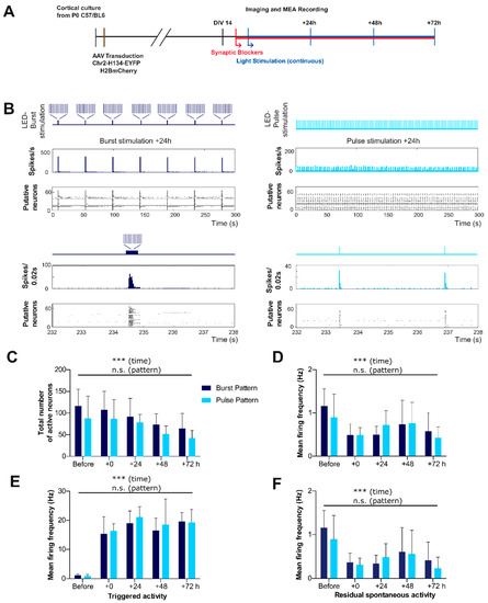 Importantly, both patterns consisted of the same number of stimuli (17.16 stimuli/min). MEA recordings and imaging sessions were performed as described in Figure 5A every 24 h until the end of experiments (DIV17). These experiments were performed in the continuous presence of synaptic blockers (10 µM GBZ, 10 µM CNQX, and 50 µM d-APV). The application of these synaptic blockers significantly (p = 0.0007 Two-Way ANOVA) reduced the frequency of neuronal firing from 1.16 ± 0.16 Hz before to 0.49 ± 0.01 in the cultures objected for subsequent burst-stimulation and from 0.89 ± 0.22 Hz to 0.49 ± 0.07 Hz in the cultures objected to pulse-stimulation experiments. As expected from the previous results regarding the establishment of the stimulus parameters (Figure 3 and Figure 4), neurons responded well to both stimulus paradigms, burst as well as pulse pattern (Figure 5B). To confirm that the general properties of neuronal activity are comparable between the two distinct stimulus paradigms, we first compared the quantitative parameters of neuronal activity between burst- and pulse-treated cultures. Cultures exposed to pulse patterns showed an equal number of active neurons when compared to cultures exposed to a chronic physiological burst pattern (Figure 5C). The number of active neurons in the burst-treated cultures was 116.5 ± 15.7 under non-stimulated control conditions, 107.3 ± 17.57 at 0 h, 91.83 ± 17.17 at 24 h, 73.67 ± 9.95 at 48 h, and 64.17 ± 14.42 at 72 h (n = 6 cultures, Figure 5C). In the pulse-treated cultures, the number of active neurons amounted under control conditions to 87 ± 21.24, at 0 h to 86.5 ± 18.13, at 24 h to 78.33 ± 7.57, at 48 h to 51.67 ± 7.51, and at 72 h to 41.67 ± 7.39 (n= 6 cultures; interaction p = 0.93 and pattern p = 0.24 Two-Way ANOVA). However, under both conditions, the number of active neurons in cultures decreased significantly over the time course of the experiments (time p < 0.0001 Two-Way ANOVA). Analysis of the mean frequency of all recorded extracellular spikes revealed that neuronal firing frequency also remained stable throughout the 72 h interval of the experiment and was not affected by the type of optogenetic stimulation (Interaction p = 0.41; Pattern p = 0.81 Two-Way ANOVA, Figure 5D). In cultures subjected to the burst protocol the mean firing frequency was 0.49 ± 0.01 Hz at 0h, 0.50 ± 0.08 Hz at 24 h, 0.74 ± 0.22 Hz at 48 h and 0.58 ± 0.17 Hz at 72 h (n = 6 cultures). In cultures subjected to the pulse protocol, the mean firing frequency was 0.49 ± 0.07 Hz at 0 h, 0.72 ± 0.14 Hz at 24 h, 0.76 ± 0.20 Hz at 48 h and 0.43 ± 0.10 Hz at 72 h (n = 6 cultures). Thus, quantitative analyses of activity confirmed that neuronal cultures subjected to optogenetic pulse stimulation showed the same general levels of activity as cultures, in which spontaneous activity pattern was replaced by a physiological burst pattern.