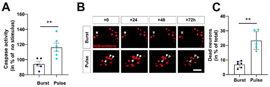 In addition, we performed a longitudinal analysis of cell survival based on the H2B-mCherry nuclear signals of neurons throughout the experiment (DIV14-17; Figure 6B). For this longitudinal analysis, we analyzed nuclear H2B-mCherry signals of 271.8 ± 14.6 neurons per culture (average number of H2B-positive neurons in the field of view covering roughly the 120-electrode MEA array at DIV14). Cell death rates were compared at the end of the experiment at DIV17, thus after 72 h of continuous patterned optogenetic light stimulation. In line with the preceding elevation of caspase activity at DIV16, we observed that the fraction of dying neurons in cultures stimulated with the burst-like protocol (7.01 ± 0.91%; n = 6 cultures) was significantly (Mann–Whitney test p = 0.002) lower than in the cultures exposed to the pulse-like optogenetic stimulus protocol (23.45 ± 2.47%; n = 6 cultures, Figure 6B). In addition, in line with the results from the caspase assay, the fraction of dead neurons during optogenetic light stimulation was increased compared to control experiments under synaptic blockade but with absent light stimulation (4.13 ± 2.7%, n = 4 cultures) when the pulse-like stimulus pattern was applied (One-Way ANOVA p < 0.0001, posthoc test control vs. pulse p < 0.0001) but remained comparable when the burst-like stimulus pattern was applied (posthoc test control vs. burst p = 0.62). Thus, optogenetic stimulation with a protocol that resembles physiological activity is significantly more effective in protecting neurons from neuronal apoptosis than a stimulus protocol that delivers a similar number of action potentials with a non-physiological distribution.