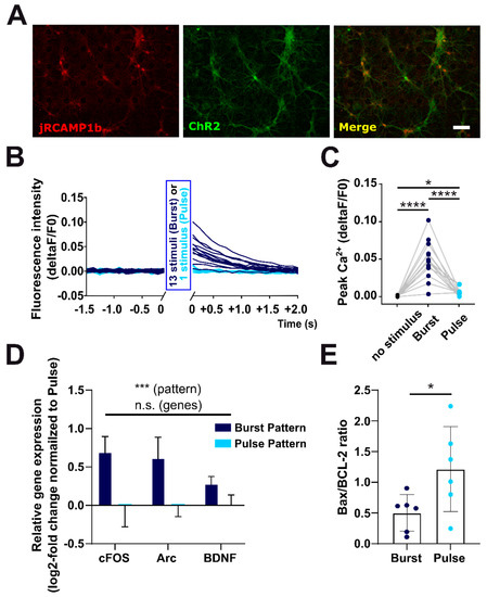 To investigate the regulatory mechanisms that underlie these activity-pattern-dependent differences in neuronal survival rates on the molecular level, we performed quantitative real-time PCR of some classical activity and apoptotic regulatory elements upon 48 h of continuous burst-like or pulse-like optogenetic light stimulation. Using this protocol, we analyzed the relative expression of the transcription factors c-Fos and Arc [38], classical markers for neuronal activity, the brain-derived neurotrophic factor (BDNF [39], as well as Bax and BCL-2, important regulators of apoptosis [40]. Our results demonstrated that the expression levels for all of these candidate genes differed significantly upon a 48 h stimulation with the physiological burst or the non-physiological pulse pattern (Two-Way ANOVA stimulus pattern p = 0.0008, n = 6/6 cultures) (Figure 7D,E). In line with a stronger pro-survival effect of the optogenetic burst stimulation and a higher peak calcium response, the classical immediate early genes c-Fos, Arc and the neurotrophic factor BDNF were significantly upregulated (Two-Way ANOVA stimulus pattern p = 0.0005 genes p = 0.70 interaction p = 0.35) at 48 h hours after start of stimulation with burst pattern (Relative expression c-Fos: Burst 0.69 ± 0.22 Pulse 0.00 ± 0.28; Arc: Burst 0.62 ± 0.29 Pulse 0.00 ± 0.15; BDNF: Burst 0.28 ± 0.11 Pulse 0.00 ± 0.14; n = 6/6 replicates from 3 cultures each) (Figure 7D).