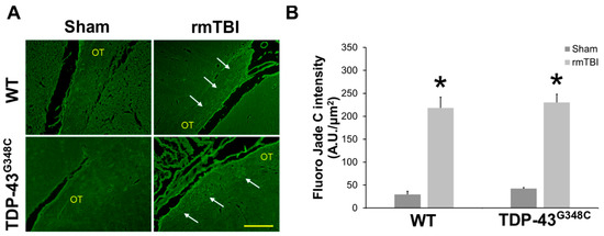 Neurodegeneration in the optic tract (OT) of wild-type (WT) and TDP-43G348C mice at 6 months after repetitive mild traumatic brain injury (rmTBI). (A) Representative microphotographs of the OT stained with the Fluoro-Jade C fluorescent dye. Arrows point to Fluoro-Jade C-positive staining. Scale bar: 100 μm. (B) The histogram shows the intensity levels of the fluorescent staining (AU/μm2) in the OT of WT and TDP-43G348C mice of the control groups (Sham) and animals with rmTBI. Results are expressed as means ± SEM (N = 5). * p < 0.05, significantly different from the related Sham.