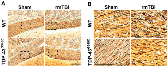 Axonal degeneration in the optic tract (OT) of wild-type (WT) and TDP-43G348C mice at 6 months after repetitive mild traumatic brain injury (rmTBI). (A) Representative microphotographs of the OT stained with the silver staining in the mice of the control group (Sham) and the animals with rmTBI. Scale bar: 200 μm. (B) Microphotographs are higher-magnification images of the areas in the boxes of the corresponding panels. Arrowheads point to the spheroids of degenerating axons. Scale bar: 50 μm.