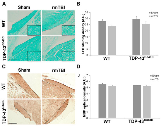 Representative photomicrographs of the OT sections stained with LFB in the traumatized wild-type and TDP-43G348C mice, as well as in the sham animals, are shown in Figure 3A. It is evident that myelin density and integrity of myelinated fibers were approximately equal in sham-treated wild-type and transgenic TDP-43 animals, while reduced myelin in some parts of the OT, characterized by porous and weaker LFB staining, was detectable in traumatized mice of both genotypes (Figure 3A). Quantitative analysis demonstrated that the staining densities in the OT of the injured wild-type and TDP-43G348C mice were slightly decreased in comparison to the levels in the related sham animals, but a statistically significant difference was not detected (p = 0.097). In addition, a significant difference in the levels of the LFB staining between the traumatized wild-type and TDP-43G348C transgenic mice was also not revealed (Figure 3B).