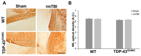 Among other roles, under physiological conditions, TDP-43 binds and stabilizes NfL mRNA, regulating its transcription, metabolism, and axonal transport [60,61,62]. Contrarily, TDP-43 dysregulation, observed, e.g., in FTLD, is associated with NfL alterations and white-matter pathology [63]. In a recent study, Kumar et al. [64] found that cytoplasmic TDP-43 accumulation in mice expressing ALS-linked human TDP-43A315T mutant caused marked suppression of mRNA translation for NfL, Nf medium, and α-internexin, resulting in a decrease in the levels of these proteins at 12 months of their age when they exhibited TDP-43 proteinopathy in cortical neurons. In our research, we were interested if repetitive mTBI affects NfL chain staining intensity in the OT of mice presenting with cytoplasmic TDP-43 aggregates in the spinal cord starting at approximately 10 months of age and increased pathological TDP fragment in the brain and spinal cord at 10 months of age [28]. We did not detect any significant changes in NfL chain staining in the OT of injured TDP-43G348C mice compared to the related sham group or between traumatized wild-type and TDP-43 transgenic animals at 6 months following repeated head injury, suggesting that repetitive mTBI and the investigated genotype did not affect the structure and, consequently, function of this neuronal cytoskeletal protein in the used experimental conditions. Because the age of our experimental animals was approximately 8.5 months at the time of the experiments, it remains to be investigated whether there are age-dependent changes in NfL chain expression in mice of the tested TDP-43 genotype.