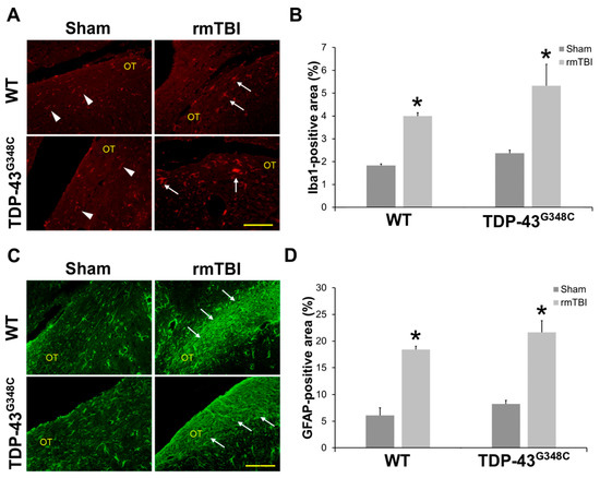 Neuroinflammation is one of the most important processes developing after head trauma that may have beneficial or detrimental effects in the acute TBI [65]; however, if it is chronic, it usually contributes to the brain damage [66,67,68]. In the current study, pronounced microglial and astrocytic response to the repetitive mTBI was found in the OT of the injured wild-type and TDP-43 transgenic mice related to their sham groups, suggesting chronic neuroinflammation of this structure as a result of synergistic exacerbating effects of repeated head traumas that provoked an increase in inflammatory responses during short time periods between each injury. In our previous study, using the same closed head weight drop method, significant microgliosis and astrocytosis were also demonstrated in traumatized wild-type and TDP-43G348C mice, in the acute and subacute posttraumatic periods [27]. Our previous and current results regarding gliosis in the OT following repetitive mTBI are in agreement with those obtained in animal studies in which the rodents were subjected to impacts induced by other methods and in which various head trauma protocols and different posttraumatic time points from 1 to 365 days after the injury were used [31,33,43,49,50,51,52,59,69,70]. Our study found no differences in the microglial and astrocytic hyperactivities between injured transgenic TDP-43 and wild-type mice, suggesting that the investigated genetic background did not affect inflammatory parameters used in this research. Taking all the abovementioned results together, it may be suggested that the OT is particularly susceptible and vulnerable to neuroinflammation induced by repetitive mTBI.