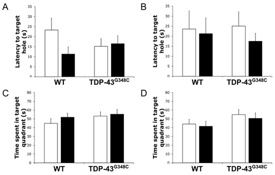 Barnes maze task performance in wild-type (WT) and TDP-43G348C mice at 6 months after repetitive mild traumatic brain injury (rmTBI). The histogram shows the latency time (s) to reach the target hole during (A) the tests and (B) the retests or the time (s) spent in the target quadrant during (C) the tests and (D) the retests for mice with rmTBI (■) and related control groups (□). Results are expressed as means ± SEM (N = 12–14).
