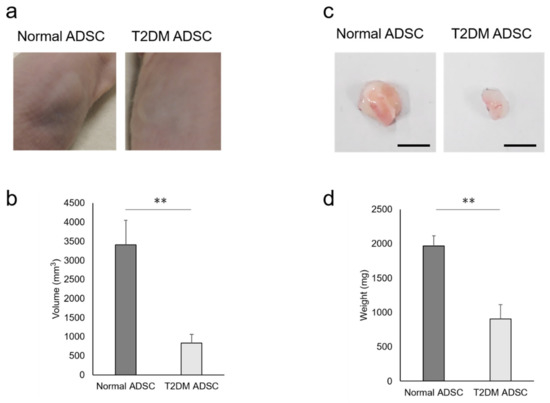 To clarify the difference in transplantation efficiency between T2DM and normal ADSCs, both were mixed with Matrigel and growth factors and then transplanted into the subcutaneous tissues of the backs of immunodeficient mice (strain name BALB/cAJcl-nu/nu). After two weeks, the sizes of transplant sites in the normal ADSC transplantation group were larger than those in the T2DM ADSC group (Figure 1a). The average volume of the transplant sites was 3407 ± 637 mm3 in the normal ADSC group, equivalent to four times that in the T2DM ADSC group, 834 ± 226 mm3 (Figure 1b). The skin grafts removed 3 weeks after the transplantation were larger in the normal ADSC group than in the T2DM ADSC group (Figure 1c). The average weight of the skin grafts was 1967 ± 151 mg in the normal ADSC group, which is equivalent to approximately 2.2 times that of the T2DM ADSC group, 903 ± 208 mg (Figure 1d). Thus, the volumes and weights of the skin grafts were significantly lower in the T2DM ADSC group than in the normal ADSC group, suggesting that the former might have lower transplantation efficiency.