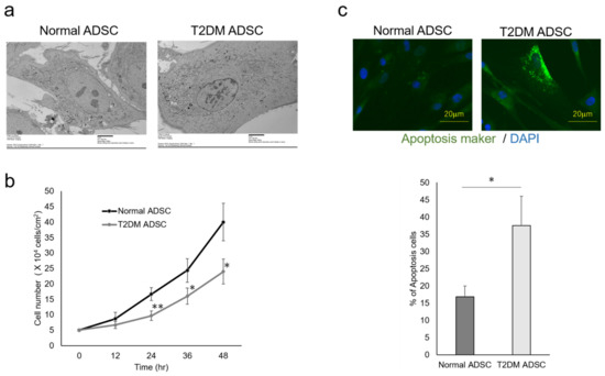 Evaluation of the cell characteristics of ADSCs derived from patients with type II diabetes mellitus. The cell characteristics of normal ADSCs and T2DM ADSCs were evaluated. (a) The electron micrographs of the normal ADSC and T2DM ADSC cellular structures, and the difference between the two images was observed. The scale bar indicates 6 μm. (b) The difference in cell growth rate in a 12 h time-course variation of cell count (cells/cm2) is shown. ** p vales = 0.0093 (24 h), * p vales = 0.0354 (36 h), * p vales = 0.019 (48 h). (c) The difference in cell death in terms of positive cell rate is shown. The apoptotic marker-positive cells were detected by staining with a fluorescent dye, FITC, using an apoptotic detection kit, and the positive cell rates are shown as the mean ± SE. The number of samples was n = 3. The percentage of apoptosis maker-positive cells was evaluated three times independently. The unpaired t-test was used to test for statistical significance. * p value = 0.0173. The scale bar indicates 20 μm.