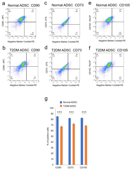 Evaluation of the stemness of ADSCs derived from patients with type II diabetes mellitus. The variation in stem cell rates of normal and T2DM ADSCs was evaluated by flowcytometry. (a) The distribution of the stem cell marker, CD90, in the normal ADSCs is shown. (b) The distribution of the stem cell marker, CD90, in the T2DM ADSCs is shown. (c) The distribution of the stem cell marker, CD73, in the normal ADSCs is shown. (d) The distribution of the stem cell marker, CD73, in the T2DM ADSCs is shown. (e) The distribution of the stem cell marker, CD105, in the normal ADSCs is shown. (f) The distribution of the stem cell marker, CD105, in the T2DM ADSCs is shown. The stem cell marker-positive cell rates were calculated. (g) The stem cell marker-positive cell rates in terms of mean ± SE are shown. The number of samples was n = 3. The percentage of CD maker-positive cells was evaluated three times independently. The unpaired t-test was used to test for statistical significance. For CD90, *** p = 0.0002. For CD73, *** p = 0.0006. For CD105, *** p = 0.0004.