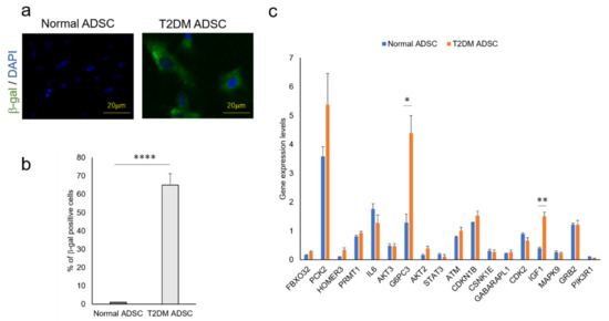 Quantitative analysis of cell aging of ADSCs derived from patients with type II diabetes mellitus and the genes related to the FoxO signaling pathway. The difference in cell aging between the normal and T2DM ADSCs and the expression levels of the genes related to the FoxO signaling pathway were quantified. (a) The images of aged cells labeled with green fluorescent dye using a cell aging marker, β-gal, are shown. The aging marker-positive cells were counted. (b) The positive cell rates in terms of mean ± SE are shown. The number of samples was n = 3. The percentage of β-gal positive cells was evaluated three times independently. The unpaired t-test was used to test for statistical significance. **** p value < 0.0001. (c) The genes related to the FoxO signaling pathway in normal and T2DM ADSCs were quantified using quantitative PCR. The quantified genes in terms of mean ± SE. The number of samples was n = 3. The gene expression level was evaluated three times independently. The unpaired t-test was used to test for statistical significance. For G6PC3, * p = 0.0196. For IGF1, ** p = 0.0035.