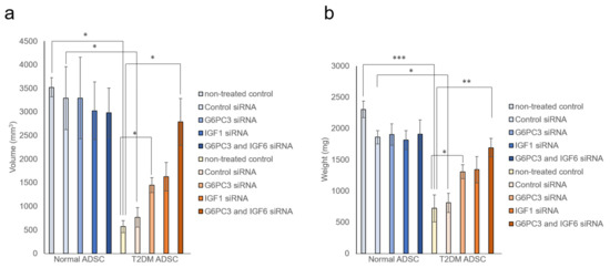 In an experiment of knocking down the G6PC3 and IGF1 genes, Silencer® Select Pre-designed (Inventoried) siRNA was used. For the siRNA sequences of G6PC3, (5′)-GGA UCU UUC UUG GUC CAU CAG CCU A-(3′) and (5′)-UAG GCU GAU GGA CCA AGA AAG AUC C-(3′) were used. For the siRNA sequences of IGF1, (5′)-CGA GUU ACC UGU UAA ACU U-(3′) and (5′)-AAG UUU AAC AGG UAA CUC G-(3′) were used. The normal ADSCs and T2DM ADSCs with a density of ~5000 cells/cm2 were seeded on 10 cm2 Petri dishes filled with 15 mL of medium containing growth factors. Then, 24 h after cell seeding, the siRNA for G6PC3 and IGF1 genes was transfected using an electroporation device, NEPA21-S. The gene knocking down efficiency was determined using a quantitative PCR device, StepOne-Plus-01; the result showed that the expression levels of the target genes were reduced by ≥90%. The normal ADSCs and T2DM ADSCs with knocked down target genes were cultured to form spheroids 1 week before the transplantation by adding cell growth factors supplied with the Matrigel matrix for spheroid culture and the selective medium. The stem cell spheroids were mixed with the Matrigel matrix (for transplantation) at a ratio of 1:1. The mixture containing 107 ADSCs was filled in a syringe on ice and transplanted into the subcutaneous tissues of the backs of immunodeficient mice. Two weeks after the transplantation, the width, depth, and height of the transplant sites were measured using a caliper to calculate the volume (mm3). Three weeks after normal ADSC and T2DM ADSC transplantation, the skin grafts were removed to measure their weights (mg) using a precision electronic balance.