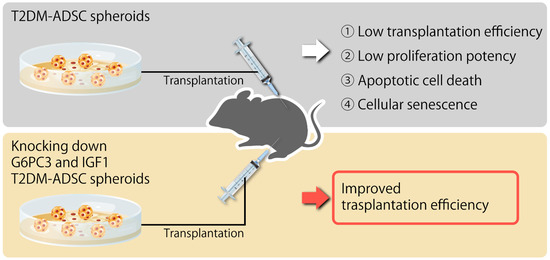 The current experimental findings are scientifically and clinically important. Mesenchymal stem cells are an excellent cell material for regenerative therapy, but the transplant ability of stem cells derived from patients with underlying diseases such as diabetes has not been clarified. Additionally, ADMSCs can be isolated with high yield by relatively low-invasive procedure. Recent studies are showing that co-transplantation with ADMSCs can increase islet survival and function, which rescues from islets loss in regenerative therapy [29]. This study revealed that stem cells from patients with type 2 diabetes are resistant to transplantation. It also revealed that knocking down of both G6PC3 and IGF1 improves transplant resistance. The results of this study revealed specific ways to improve the success rate of transplantation when diabetics perform regenerative therapy using autologous stem cells.