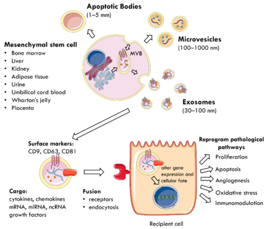 The regenerative properties of MSCs are mediated by the paracrine action of EVs delivering biomolecules to neighbouring cells [40,43,44] (Figure 1). EVs are membrane-enclosed particles classified by their cellular origin into three categories: apoptotic bodies (1–5 mm), microvesicles (MVs) or microparticles (MPs) (100–1000 nm), and exosomes (30–100 nm) [4,45]. The biogenesis of these EV subtypes is distinct [43,46] (Figure 1). Exosomes are derivatives of the endosomal compartment, secreted into the environment when multivesicular bodies (MVB) fuse with the plasma membrane [44,47,48]. Given the difficulties in differentiating the subtypes of EVs by their size, the International Society for Extracellular Vesicles (ISEV) prefers the collective term of “EVs” to define particles released from cells that are bounded by a lipid bilayer and cannot replicate [49].