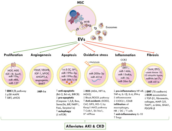 In summary, MSC-EVs ameliorate AKI by inducing tubuloepithelial regeneration and angiogenesis, and dampening apoptosis, oxidative stress, and inflammation [4,139].