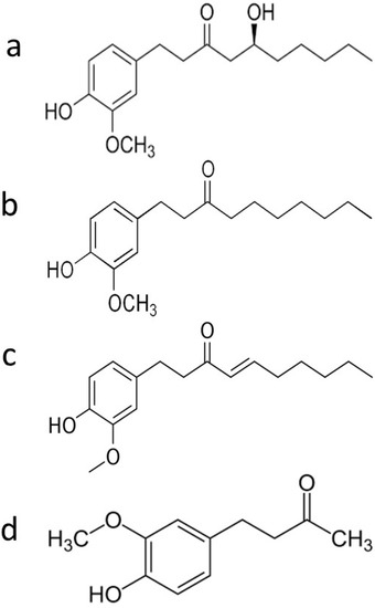 Chemical structure of main phenolic compounds of ginger: (a) 6-gingerol (1-[4’-hydroxy-3’-methoxyphenyl]-5-hydroxy-3-decanone), (b) 6-paradol, (c) 6-shogaol, and (d) zingerone.