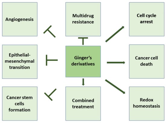 Nowadays, available drugs for treating cancer are often toxic, expensive, and little effective. Ginger derivatives possess high potential chemopreventive properties such as cell cycle arrest, increased cellular death (apoptosis, autophagy and autosis), as well as redox homeostasis unbalance. Furthermore, they inhibit angiogenesis, CSCs formation, and the EMT process. Therefore, this natural compound directly and indirectly influences tumor cell survival and inhibits invasion and metastasis processes, without significant toxic effects on normal cells [18,26]. Additionally, ginger enhances the therapeutic efficacy of the currently available anti-cancer drugs and represents a good adjuvant to certain phytochemical compounds including turmeric, garlic, and gelam honey [103,104]. A very important moment in ginger derivatives’ chemopreventive properties is that they do not cause side effects, but on the contrary, they ease the side effects provoked by other cancer treatments, like radio- and chemotherapy, giving ginger a considerable advantage in being considered a chemopreventive natural compound [105,106]. However, most of the known activities of ginger components have been studied only in in vitro and in vivo studies, except for a few clinical studies in human subjects. Therefore, more substantial and well-controlled clinical human studies are needed to illustrate its efficacy as an anticancer agent, since it is a safe and encouraging alternative. The recent development of nanotechnologies (polymer nanoparticles or micelles, liposomes, inorganic nanoparticles, and nano-emulsions) provides a chance to improve oral absorption, bioavailability of ginger, while also improving the target ability and its therapeutic effects [28,102]. In summary, ginger derivatives have various health effects and therapeutic properties; nevertheless, their biological applications are limited due to their hydrophobic nature. The low aqueous solubility of this compound seems to be the major obstacle for its lab-to-clinic development as a drug; therefore, it appears to be necessary to use advanced extraction methods to improve its bioavailability.