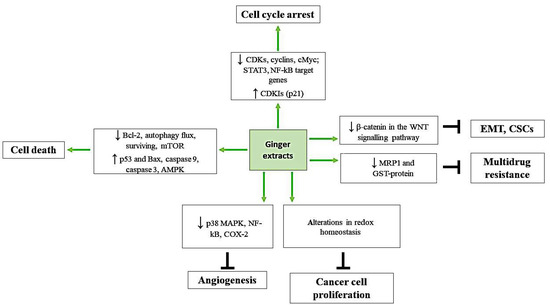 A schematic diagram showing main molecular targets of ginger derivatives. The natural compound participates in the cell cycle arrest by inhibiting the expression of cyclins, CDKs, and levels of STAT3, NF-kB target genes, and by activation of cell cycle check points and increased expression of p21. Moreover, by increasing Bax/Bcl-2 ratio outburst of cytochrome C, activating AMPK, and by decreasing autophagy flux and survivin expression, ginger derivatives provoke cancer cell death. They participate in the alteration of redox homeostasis, which stops cancer cell proliferation. By blocking activation of p38 MAP kinase (p38 MAPK) and NF-kB, ginger derivatives inhibit COX-2 expression and as a result block angiogenesis. Ginger extracts decrease β-catenin in the WNT signaling pathway, which leads to the inhibition of gene transcription, involved in EMT and CSCs, and, additionally, downregulate MRP1 and GST-protein expression, involved in multidrug resistance.