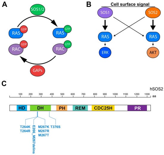 The specific, functional involvement of SOS2 in different pathologies has also been recently reported, although with lower incidence rates than for SOS1 []. Pathologies linked to SOS2 alterations include different inherited proliferative/developmental disorders (RASopathies), as well as sporadic tumors and other nontumoral diseases.